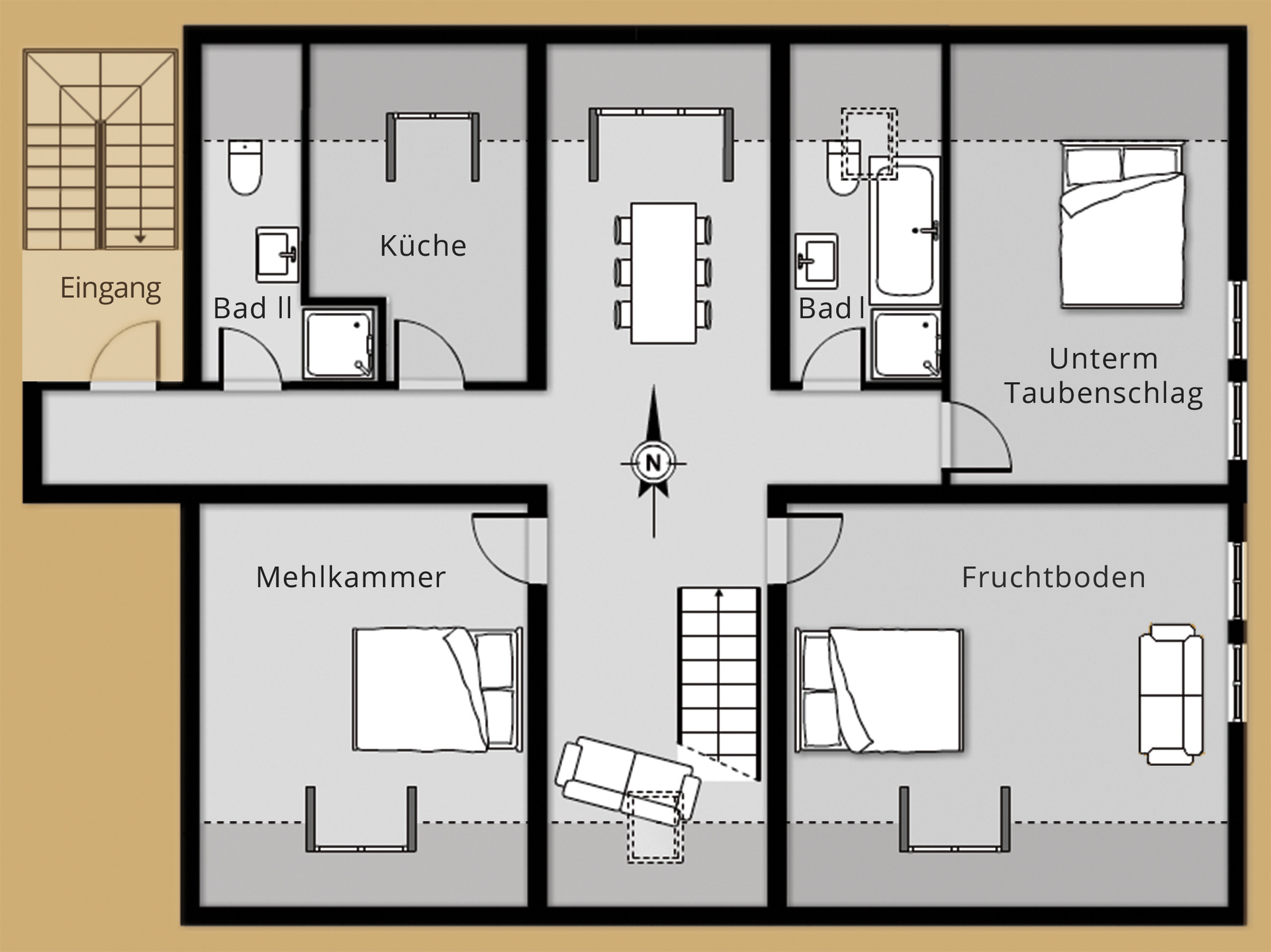 Im obersten Stockwerk unseres 1758 erbauten, denkmalgeschützen Fachwerkhauses befinden sich die Räumlichkeiten für unsere Gäste. Drei große Schlafzimmer, zwei Bäder, eine Küche sowie ein Wohn- und Essbereich stehen Ihnen je nach Wunsch und Bedarf als Einzelzimmer, Doppelzimmer oder in Kombination als Ferienwohnung zur Verfügung. Die ansprechend gestalteten und großzügigen Räumlichkeiten sind allesamt gemütlich und komfortabel ausgestattet und bieten Ihnen Übernachtungsmöglichkeiten mit Wohlfühl-Charakter.