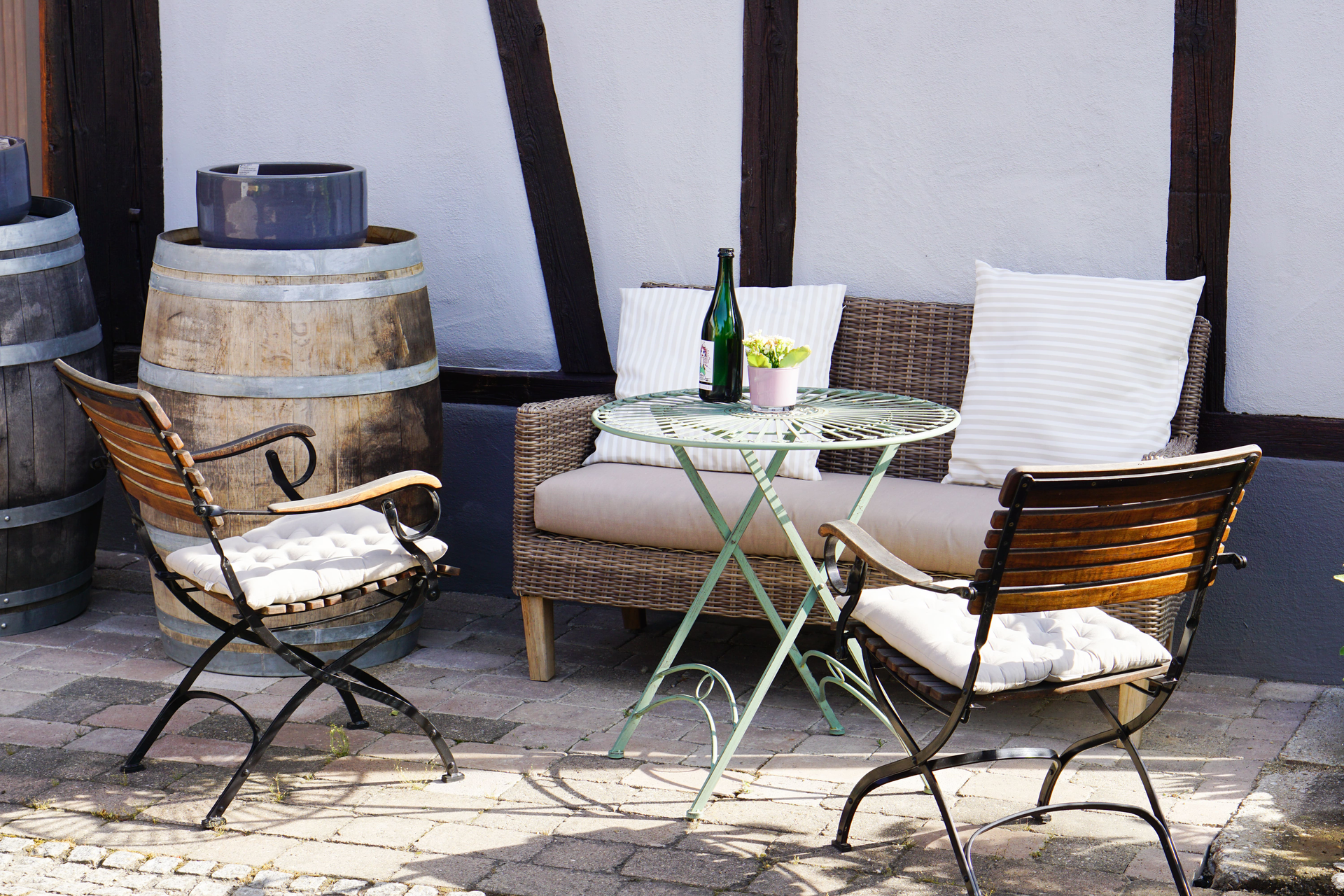 Bei schönem Wetter, sehr gerne bei uns im Garten oder Sie finden ein gemütliches Plätzchen in unserer Wohlfühl-WEIN.Scheune.