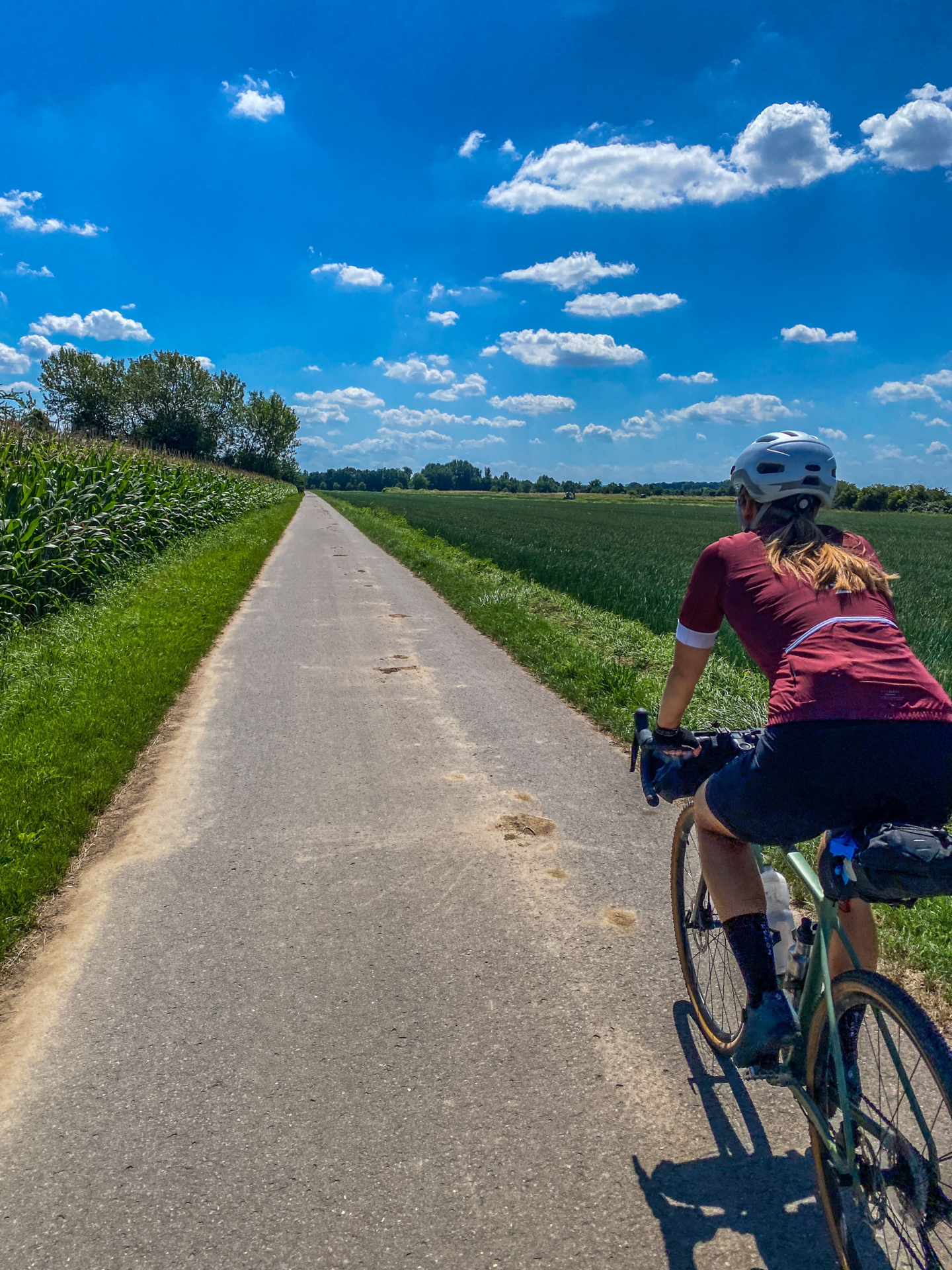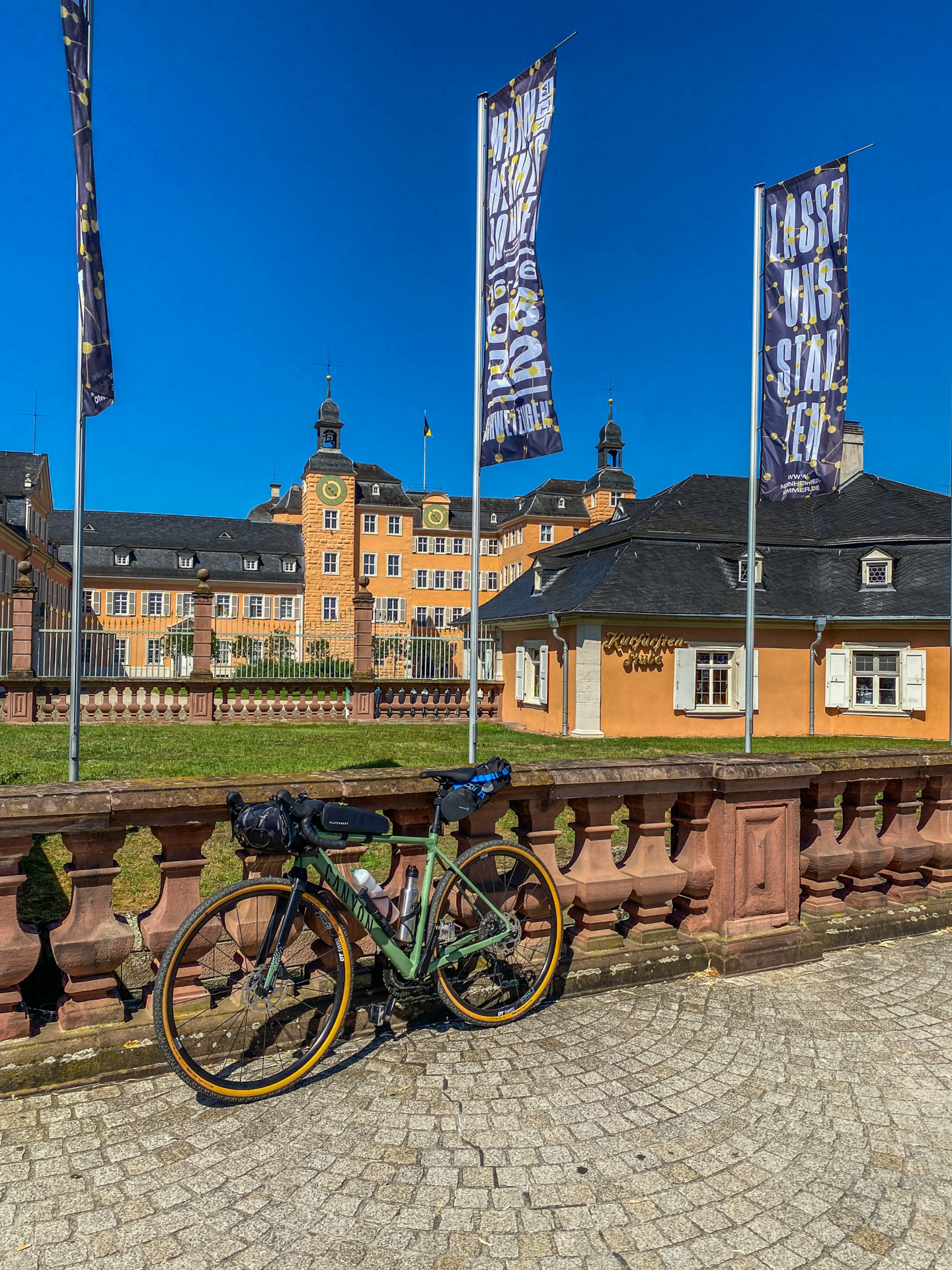 Du verlässt den Bahnhof am südlichen Ausgang und startest Richtung Rhein. Die ersten Kilometer begleitet Dich der Rhein, bevor Du in die grüne Lunge Mannheims, den Waldpark abbiegst. Nach dem Waldpark führt Dich der Weg durch Rheinau und anschließend in den Hirschacker und Dossenwald, wo Du das erste Mal Schotter unter Dir spürst. Das erste größere Highlight wartet im Anschluss auf Dich: das Schwetzinger Schloss. Mit den Palmen, den kleinen Eisdielen und den Sitzmöglichkeiten hast Du direkt das Gefühl, Du seist im Urlaub angekommen. Von hier aus geht es weiter durch den weitläufigen Schwetzinger Hardt, vorbei an Wildgehegen über einsame Schotterpisten.