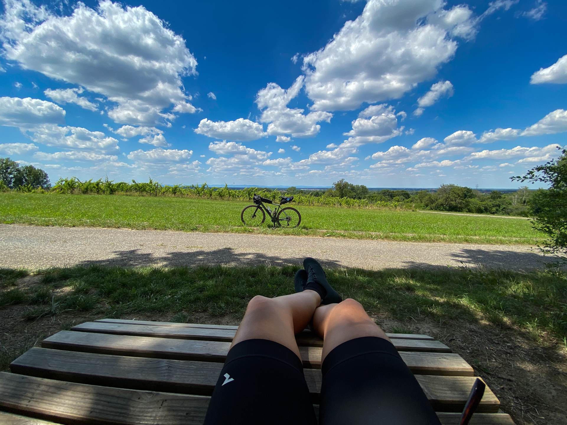 Ist der Schwetzinger Hardt einmal durchquert, gelangst Du auf den Kraichradweg, der sich entlang des Kraichbachs schlängelt und Dich bis nach Bad Schönborn begleitet. Der St. Leoner See kann Deine erste willkommene Abkühlung auf der Strecke sein. Bad Schönborn ermöglicht Dir nach etwa der Hälfte der Etappe eine gute Möglichkeit zum Einkehren. Entspanne Dich im Sole-Aktiv-Park und genieße ein erfrischendes Kaltgetränk im Biergarten des Parks. Weiter geht’s und von jetzt an wird es hügeliger, denn Bad Schönborn ist das Tor zum Hügelland. Über tolle Schotterpisten im Östringer Erlenwald erreichst Du nach der Goldköpfle-Grillhütte eine unserer vielen Hügelsofas, die entlang der Strecke auf Dich warten. Und von hier hast Du das erste Mal eine der tollen und atemberaubenden Weitsichten über Bad Schönborn bis hin zum Nordschwarzwald und der Pfalz. Und nicht nur das, ab hier fangen die Weinberge an, die Dich ab jetzt immer mal wieder entlang der Strecke begleiten.