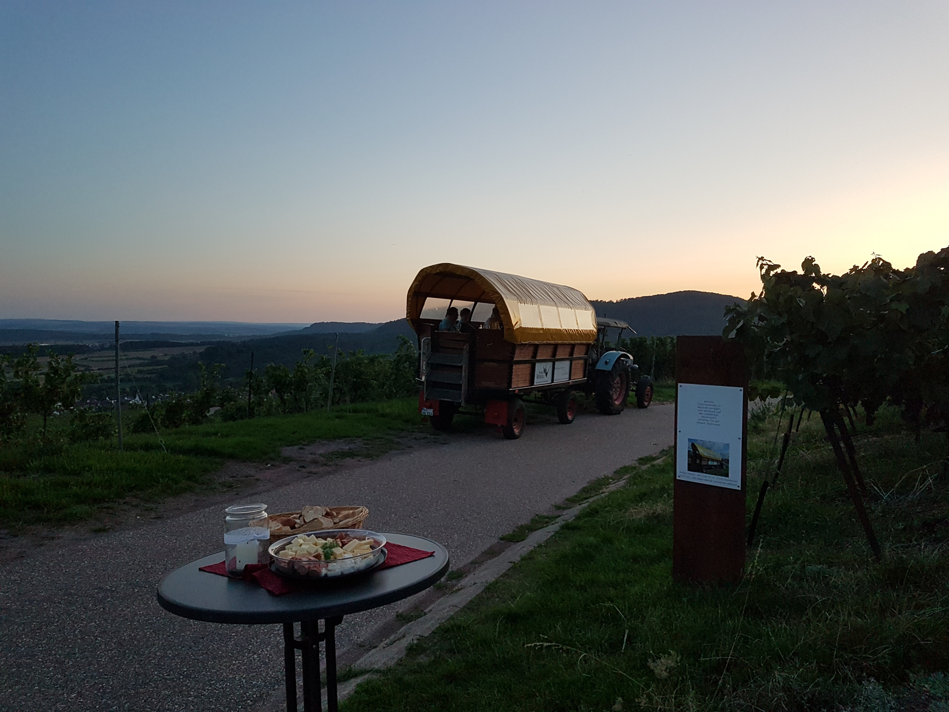 Gemeinsam genießen wir uns wir den Sommerabend bei der Planwagenfahrt und anschließend die Weine und Gebäck mit dem Ausblick ins Land.