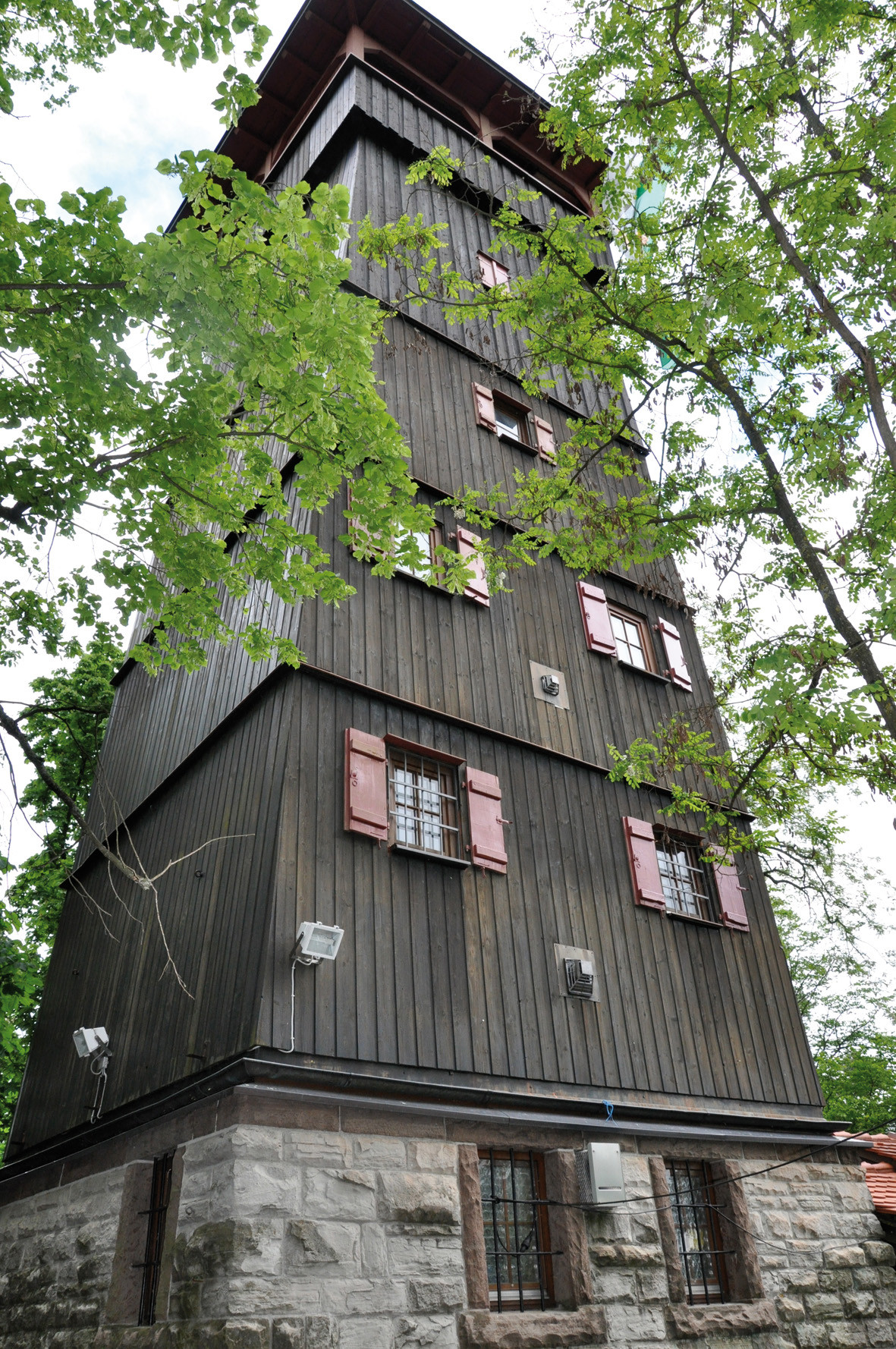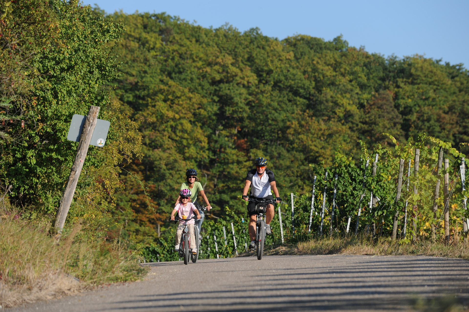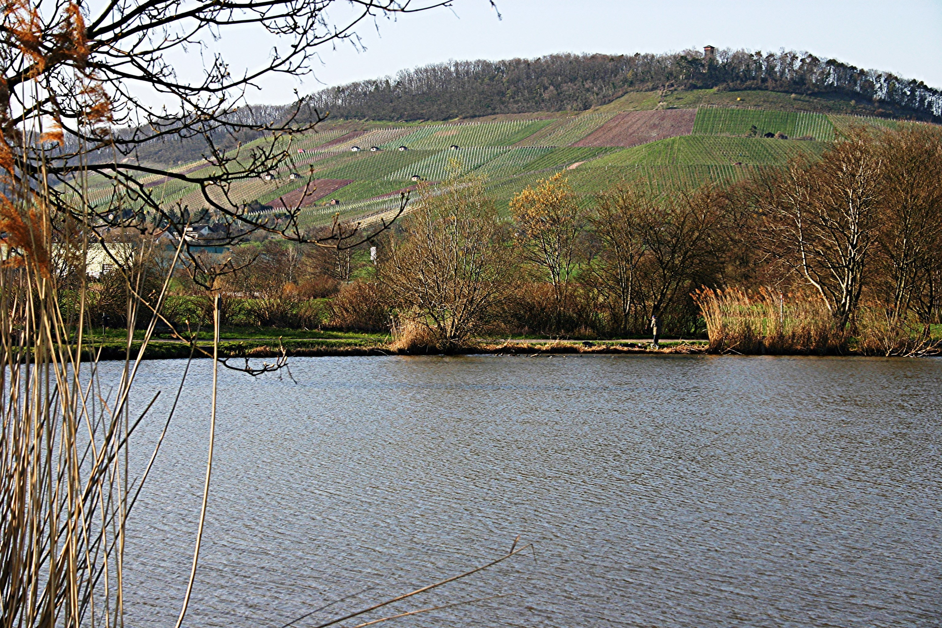 Es dauert nicht lange und wir sind am Sportgelände mit einer Infotafel angekommen. Von dort geht es zunächst rechts haltend am Waldsaum entlang und dann durch die Weinberge (gut befestigte Wege), der Beschilderung folgend aufwärts zu der im Wald gelegenen Eselsburg. Von der Burg selbst sind zwar nur noch die Burggräben vorhanden, dafür ist der Eselsburgturm an Sonn- und Feiertagen geöffnet und auch bewirtschaftet. An klaren Tagen bietet sich von oben ein faszinierender Ausblick mit Sicht zum Stuttgarter Fernsehturm, den Löwensteiner Bergen, zur Schwäbischen Alb, dem Schwarzwald und den Vogesen. Der geringe Eintritt lohnt sich allemal. Bei der Eselsburg selbst gibt es einen kleinen Spielplatz und Grillmöglichkeiten.