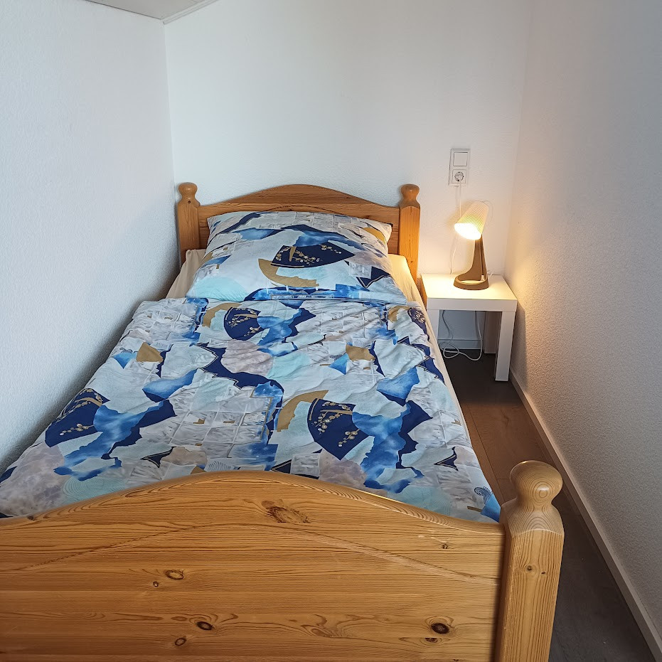 Wohnung im DG (ca.55 qm) mit großem Westbalkon. Küche (voll ausgestattet) incl. Spülmaschine, Mikrowelle, SENSEO Kaffeepadmaschine, Wasserkocher, Toaster und Kühl-Gefrierschrank. 1 Schlafzimmer als Doppel- o. Zweibettzimmer, 1 EZ, 1 Bett im Wohnzimmer, blickgeschützt in separater Nische, Wohn-Esszimmer mit grossem TV, Dusche/WC mit Tageslicht, Waschmaschine, Wäscheständer. Incl. Bettwäsche und Handtücher.