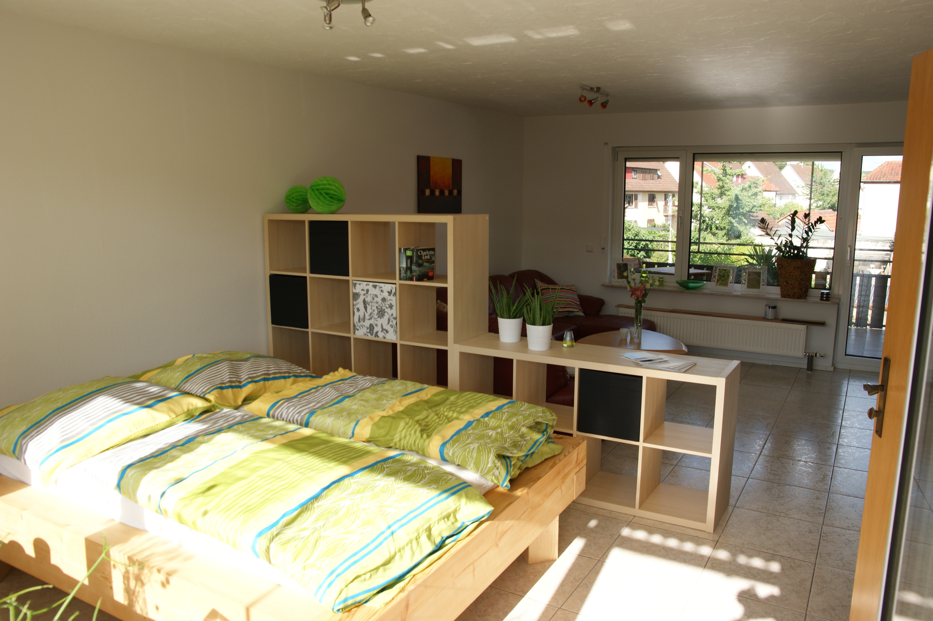 Helles und liebevoll eingerichtetes Einzimmerappartment (140 cm Bett, Küchenzeile, Wohn-/Essbereich, Dusche/WC, 2 Balkone) in Stadtnähe.