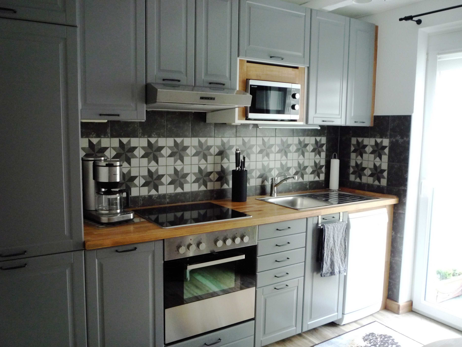 Küche mit Herd, Ofen, Mikrowelle, Spülbecken und Kafeemaschine, Kühlschrank und viele weitere graue Schränke | © Neckar-Zaber-Tourismus e.V.