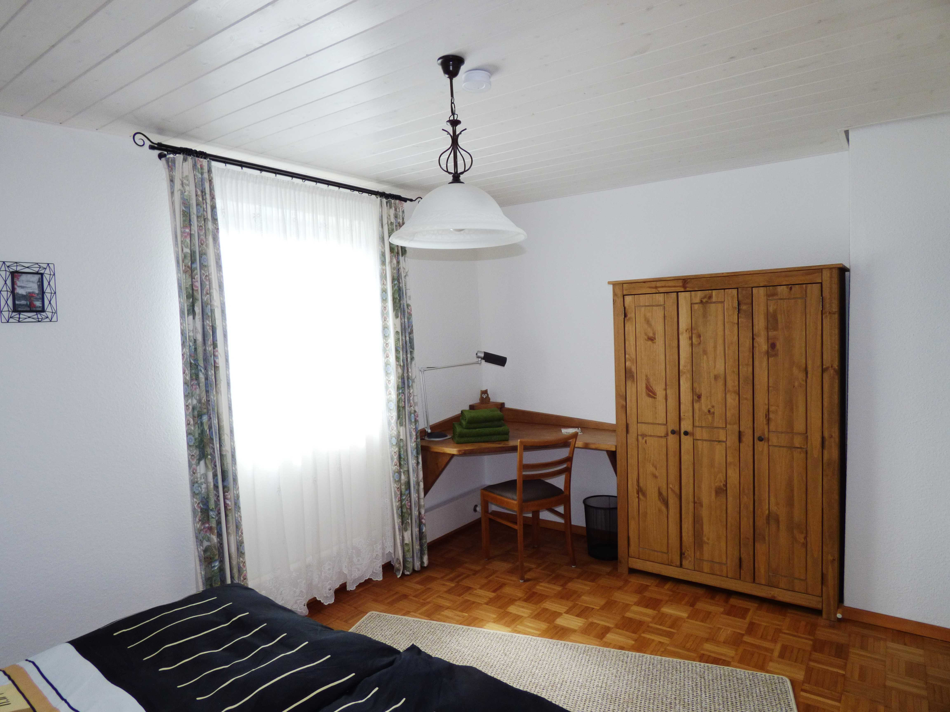 Schlafzimmer, Sicht auf den hölzernen Kleiderschrank und eine Schreibtischecke | © Neckar-Zaber-Tourismus e.V.