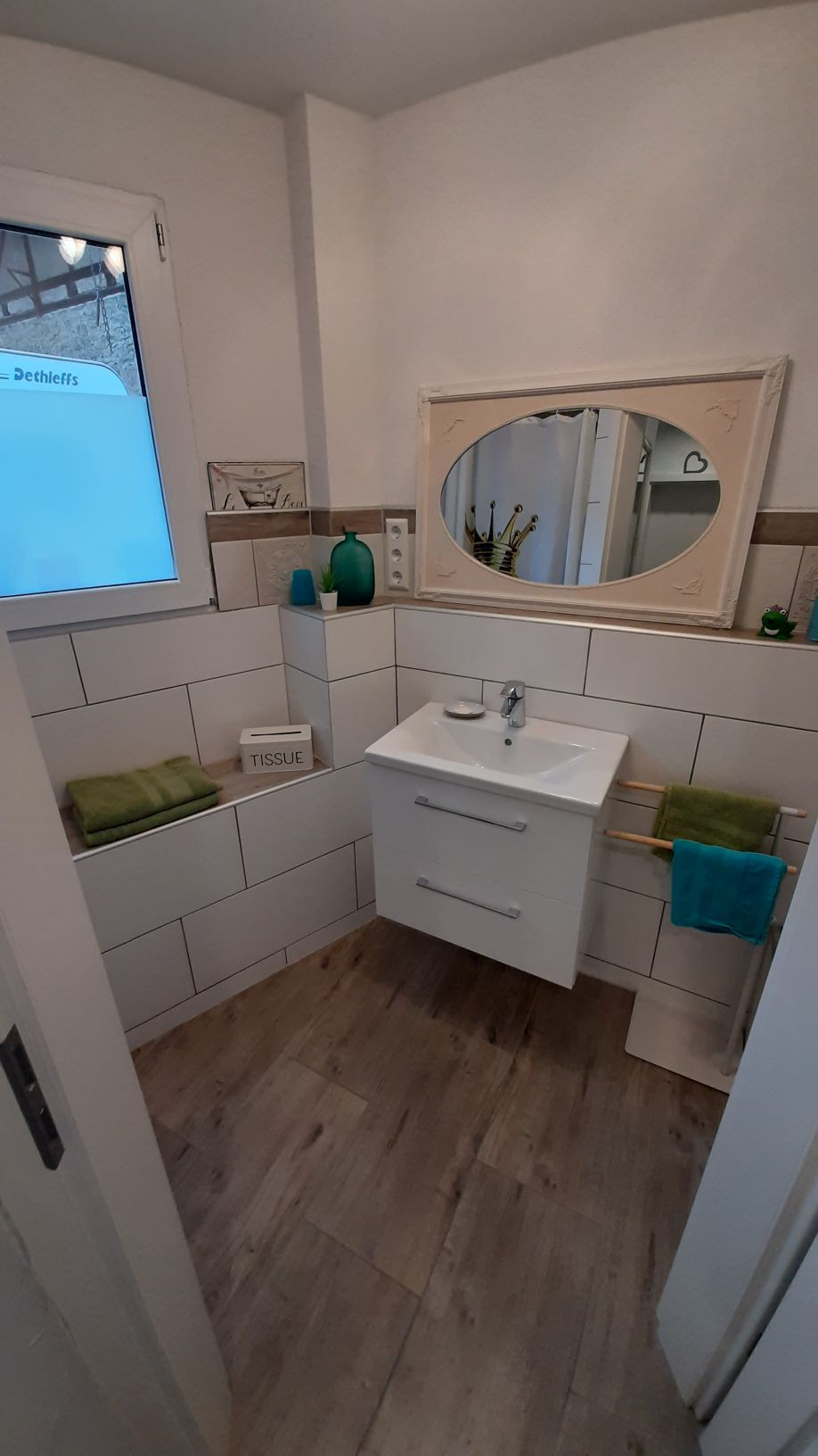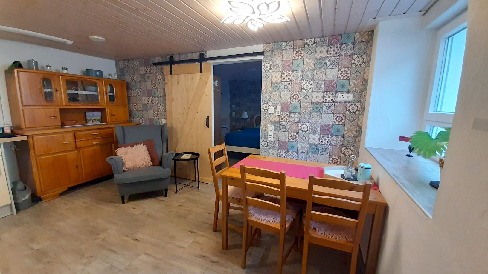 Nichtraucherwohnung, Raucherbereich im Hof vorhanden; 1 Schlafzimmer mit Doppelbett + Schlafsessel, Wohn- Essbereich mit Sitzecke, Sessel, Fernseher, voll ausgestatteter Küche (Kühlschrank mit Gefrierfach, Filterkaffeemaschine, Wasserkocher, Spülmaschine), Waschmaschine, barrierefreie Dusche, Föhn, separates WC