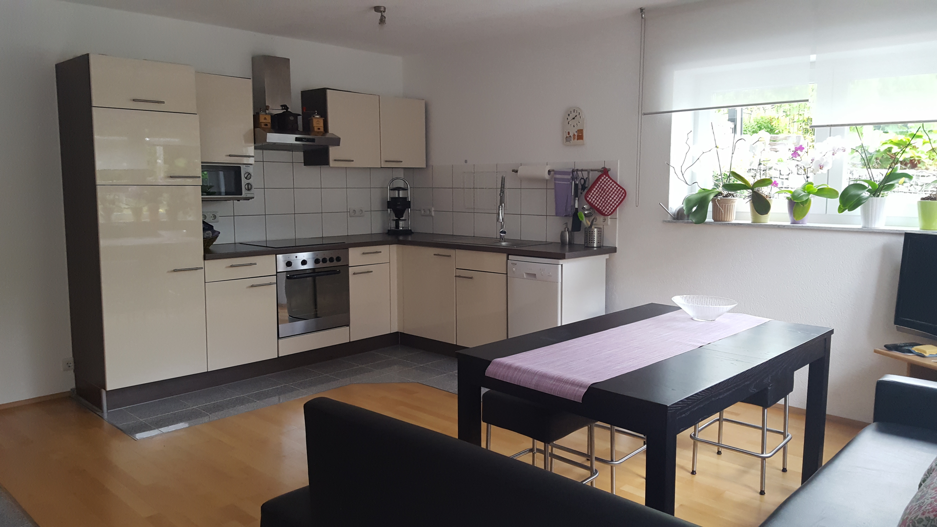 Die Küche ist voll ausgestattet mit einer Mikrowelle, einer Kühl-Gefrierkombination, einem 4 Platten Ceran-Kochfeld mit Backofen und einem Geschirrspüler.