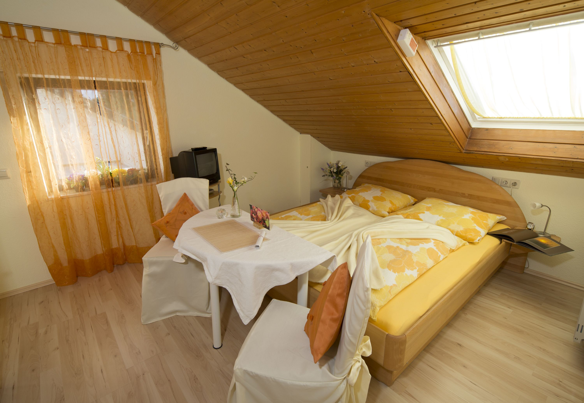 Gelb und Weiß eingerichtetes Doppelzimmer, ein kleiner Tisch mit zwei Stühlen und Kissen. | © Neckar-Zaber-Tourismus e.V.