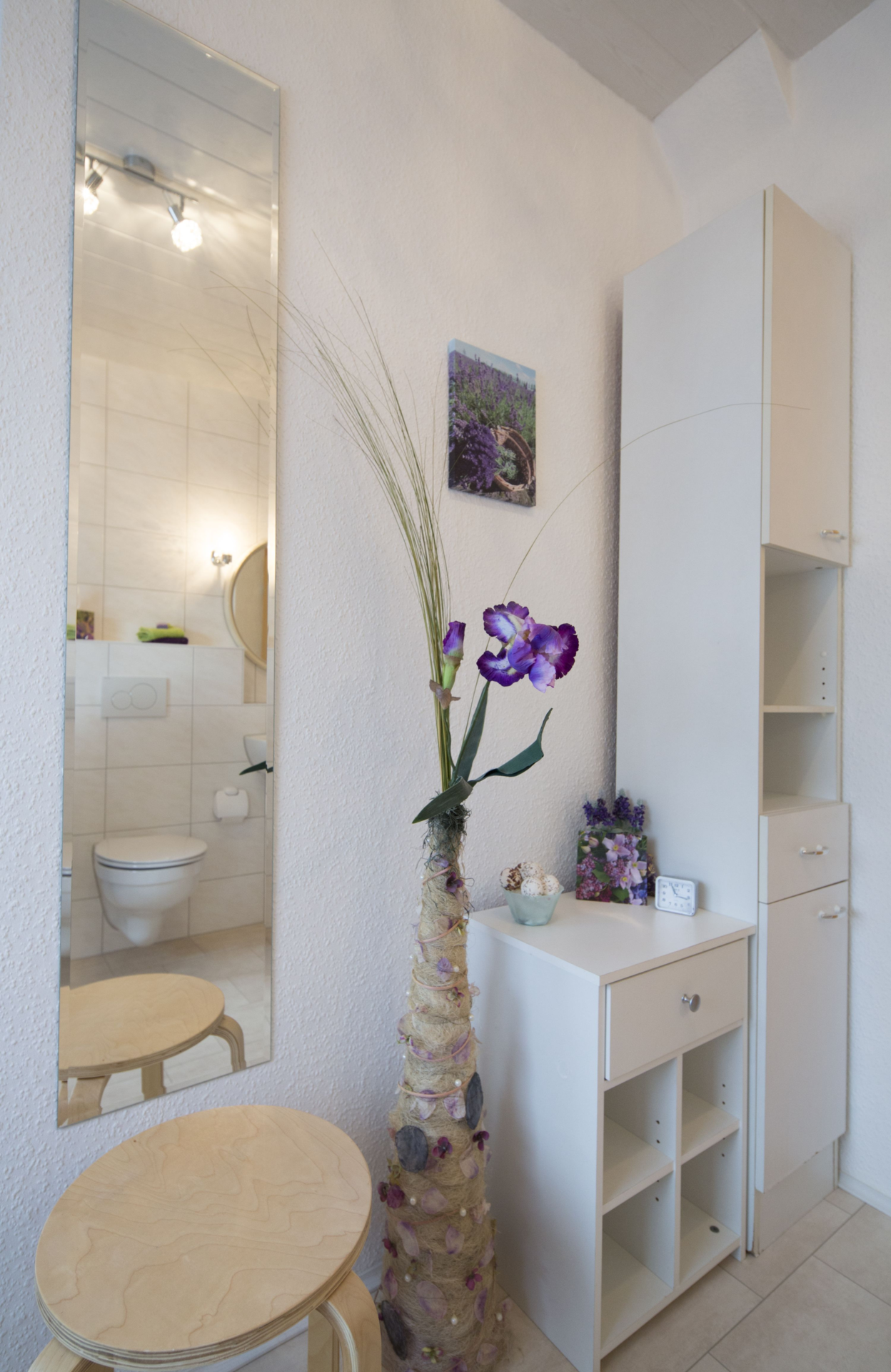 Aufnahme der weißen Schränke (einer groß, einer klein) und des Hockers, darüber ein langer Spiegel, des Badezimmers. | © Neckar-Zaber-Tourismus e.V.