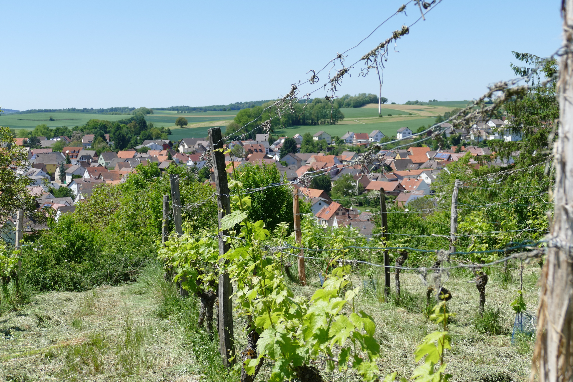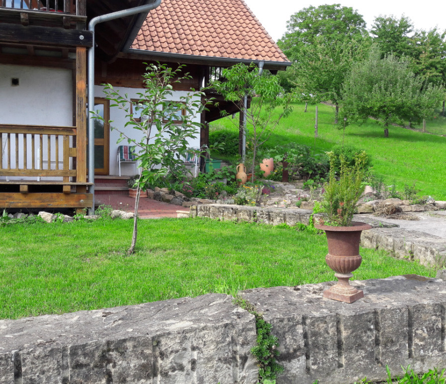 - Wieder bei der Rastbank an der Hauptwegeführung läuft man nun ostwärts hinab. Auf einer Streuobstwiese entlang des Weges befindet sich ein drehbares Hügelsofa mit herrlicher Rundumsicht in die Kraichgaulandschaft. Mit geringem Gefälle führt der Weg zurück zum Ortseingang Kraichtal-Menzingen. (Am Ortseingang kreuzt man die Hauptverkehrsstraße und biegt in die Blumenstraße ein, die auf die Schweitzerstraße mündet, dort rechts in die Schweitzerstraße abbiegen bis man vor der evangelischen Kirche steht, dort rechts in die Ahornstraße einbiegen und anschließend gleich wieder links in die Schillerstraße abbiegen (die Katholische Kirche ist auf linker Hand), die direkt zum Bahnhof führt.)