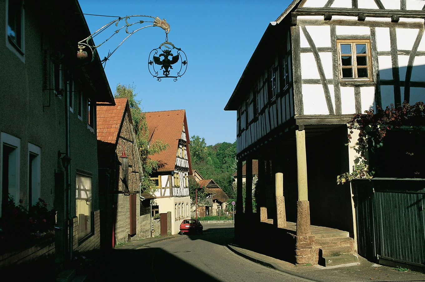 - Hat man die Durchfahrtsstraße überquert, achte man auf das Fachwerkhaus zu rechter Hand, hier ist eine seltene Säulenfachwerkbauweise zu bestaunen. (Am Ende der Oberen Schlossstraße, rechts abbiegen in Untere Schlossstraße.)