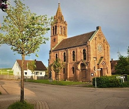 Auf der Hauptstraße in die Ortsmitte. Bei der Kirche rechts, am
