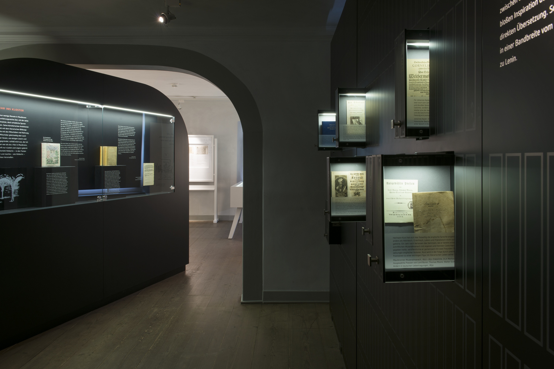 Insgesamt überblickt die Ausstellung mehr als acht Jahrhunderte und gibt rund 50 Schriftstellerinnen und Schriftstellern eine Stimme. Sämtliche Biographien und die konkreten Bezüge der Literaten zur Stadt Maulbronn können vom Besucher an einer Medienstation recherchiert werden. Unterhaltsame Kurzfilme führen hier auch in die Leben der beiden großen Maulbronner Autoren Friedrich Hölderlin und Hermann Hesse ein.