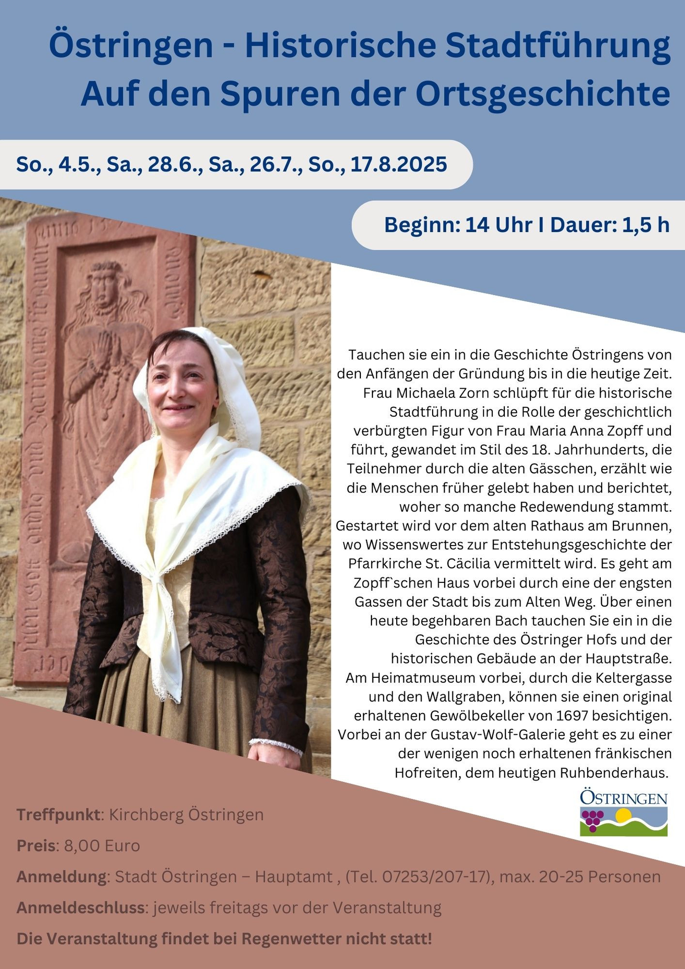 Frau Michaela Zorn schlüpft für die historische Stadtführung in die Rolle der geschichtlich verbürgten Figur von Frau Maria Anna Zopff und führt, gewandet im Stil des 18. Jahrhunderts, die Teilnehmer durch die alten Gässchen, erzählt wie die Menschen früher gelebt haben und berichtet, woher so manche Redewendung stammt.