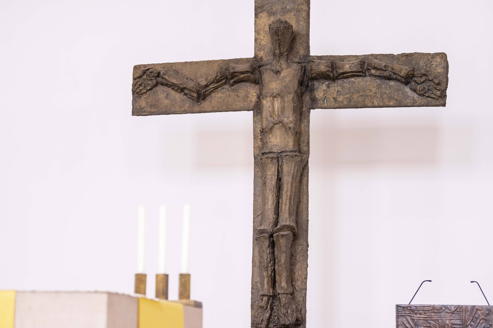 Erst im Jahr 1966 war der Kirchenflügel wieder aufgebaut. Architekt Lothar Götz gestaltete das Innere der Kirche modern und detailreich. Besonders auffallend ist die zentrale Position des Altars und das beeindruckende Bronzekreuz im Altarraum.