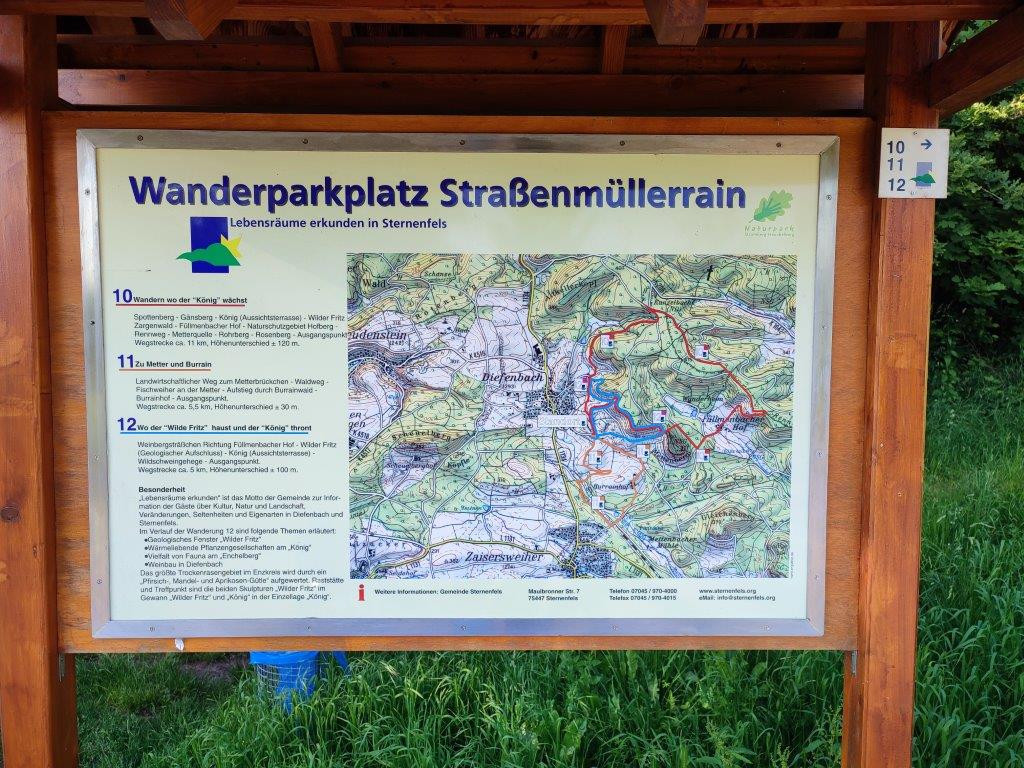 Ausgangspunkt ist der Wanderparkplatz Straßenmüllerrain in Diefenbach, etwa 500 Meter nach der Gemeindehalle in Richtung Füllmenbacher Hof. Der Wandermarkierung des Rundweges 10 folgend wird durch Streuobstwiesen dem Rebgelände entgegen gewandert. Auf dem obersten Weg angekommen, weiter südlich zwischen Rebland und Wald.