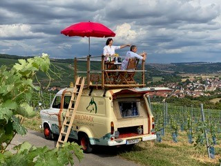 Übernachte inmitten der Weinberge: Entweder im gemütlichen Weinfass oder im Trapperbus mit Dachterrasse, immer inklusive leckerer Verpflegung.