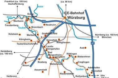 Bahnreisende gelangen überregional bequem über den ICE-Bahnhof Würzburg ins Liebliche Taubertal. Deine überregionale Anreise kannst du außerdem über die Deutsche Bahn planen.