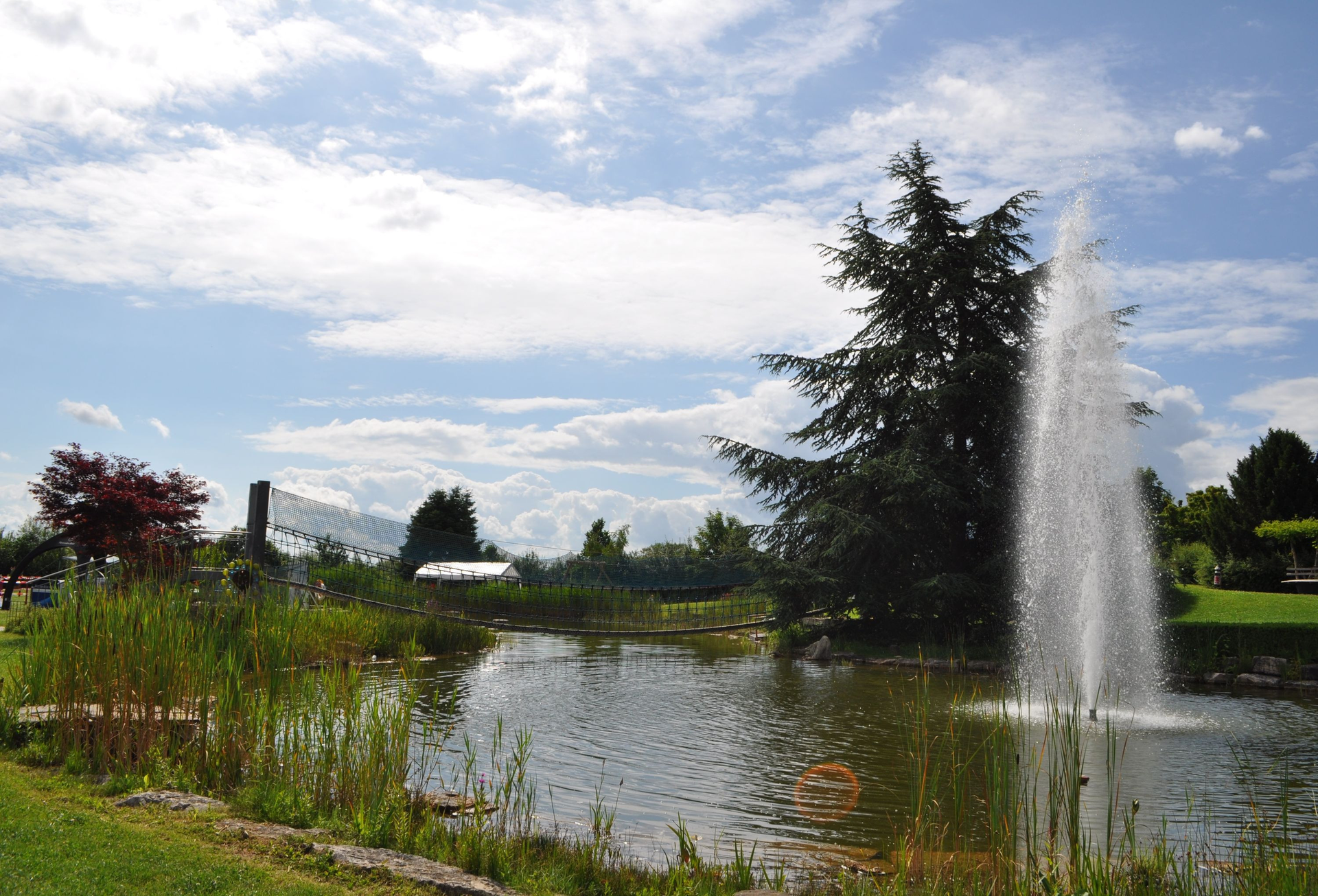 Der gepflegte Park lädt ein zu Muße in der Natur. Am idyllischen See kann man getrost die Seele baumeln lassen. Vielfältige Sitzgelegenheiten laden zu einer Pause ein. Und unter der Hängebrücke lassen sich geheimnisvolle Kois im Wasser beobachten.