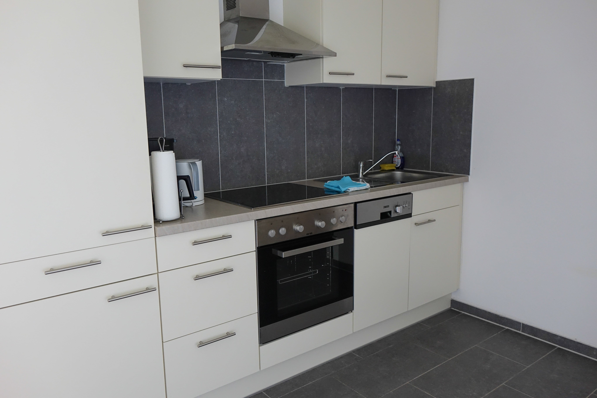 - Küche mit Toaster, Kaffeemaschine, Spülmaschine, Wasserkocher, Backofen, Kühlschrank mit Gefrierfach