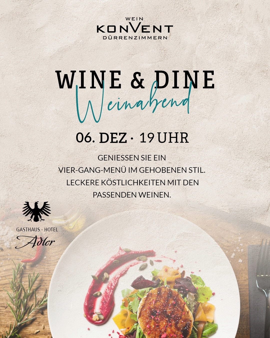 Freuen Sie sich auf einen festlichen Abend voller Genussmomente: Das Gasthaus Adler aus Botenheim verwöhnt Sie mit kreativen und fein abgestimmten Speisen. Edle Tropfen aus Holz- und Barriquefässern begleiten jedes Gericht und machen den Abend zu einem kulinarischen Highlight.