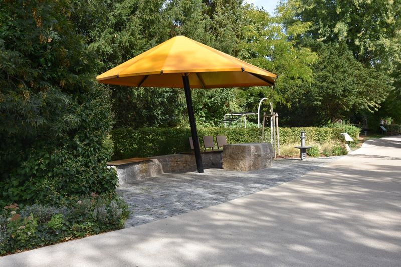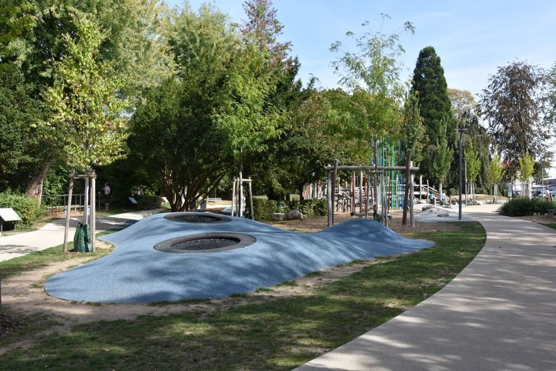 Zahlreiche Spiel- und Sportgeräte für jedermann, Sitzmöglichkeiten und überdachte Spielmöglichkeiten laden zum Verweilen ein. Erholsame Parkatmosphäre direkt an der Elsenz.