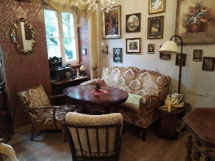 Der Thekenbereich sowie die Sitzgruppen bestehen aus liebevoll, selbstrestaurierten alten Möbel. Gemütliche Sofaecken laden zum Verweilen ein. In den Räumlichkeiten befinden sich schöne, antik anmutige Elemente, die uns an Vergangenes und Schönes erinnert.