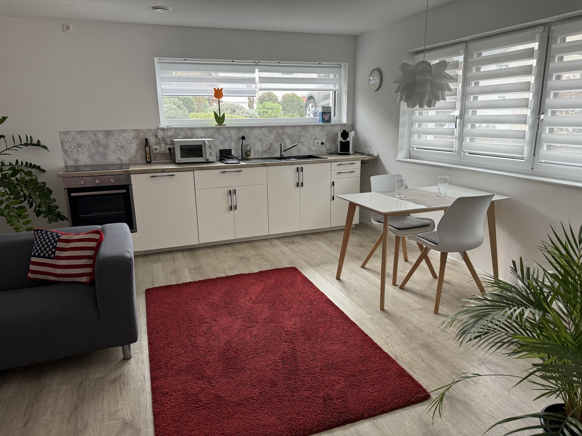 Die Wohnung verfügt über ein großes Wohn-/Esszimmer mit gut ausgestatteter Küchenzeile.