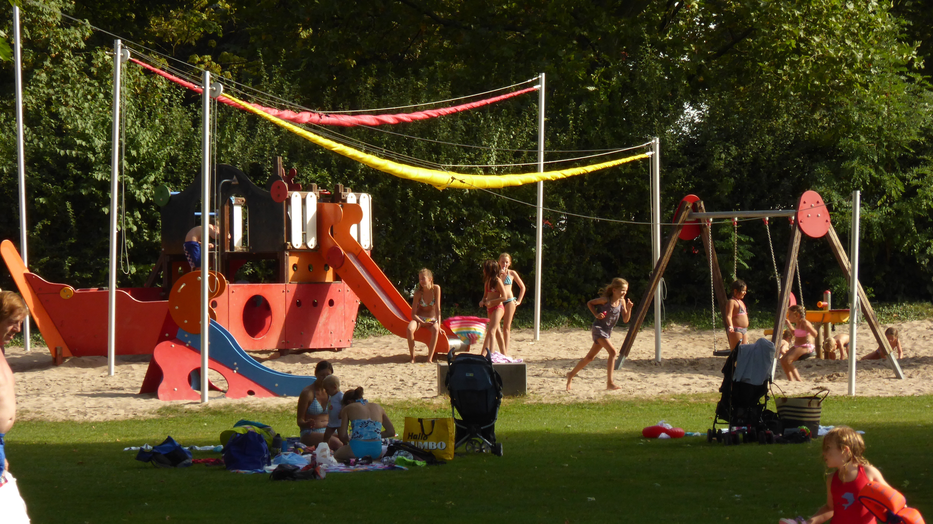 Die große Liegefläche enthält Bäume, die Schatten spenden, außerdem gibt es eine extra Sanddüne. Abseits des Wassers ist ebenfalls etwas geboten. Ein Kleinfußballfeld, Beachvolleyballfeld, ein Basketballkorb und drei Tischtennisplatten lassen keine Langeweile aufkommen. Ein großzügiger Spielbereich für Kinder bis 9 Jahre befindet sich ebenfalls auf dem Gelände. Die Cafeteria mit großer Terrasse lädt zum Entspannen ein.