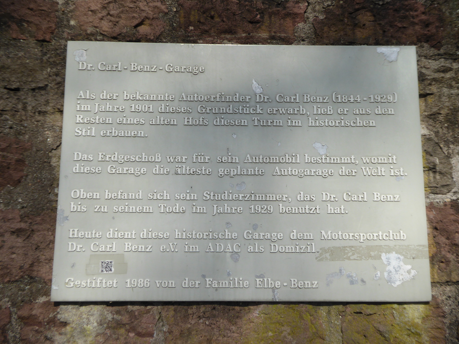 Im Park des Wohnhauses von Dr. Carl Benz wurde in Gestalt eines Wehrturms ein Gartenhaus errichtet, dessen Untergeschoss als Autogarage diente.