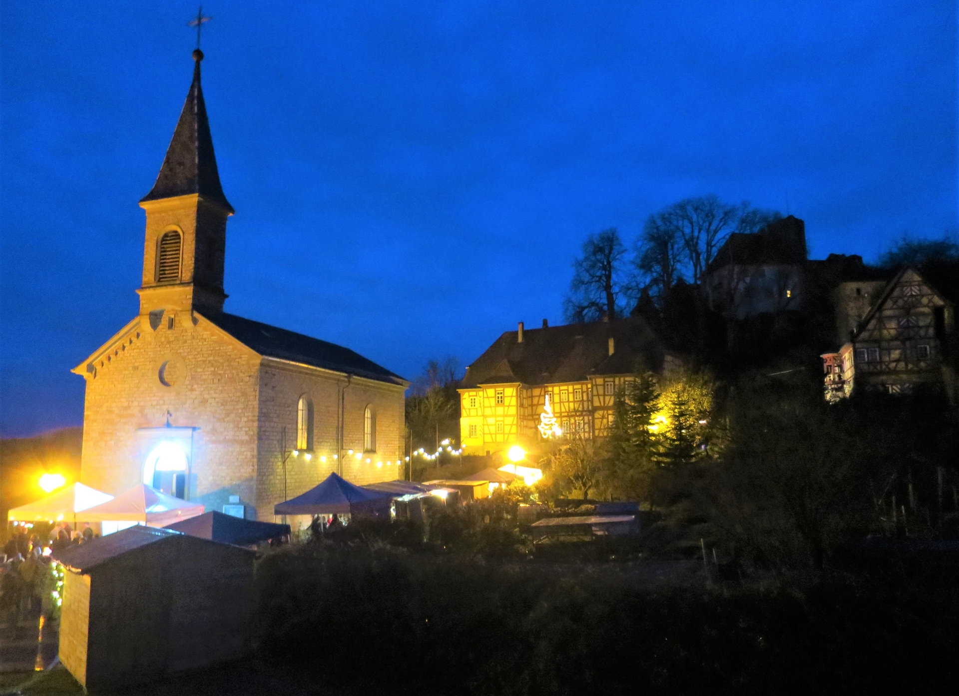 Beleuchtete Kirchen umringt von Ständen zu Weihnachten | © Gemeinde Neidenstein